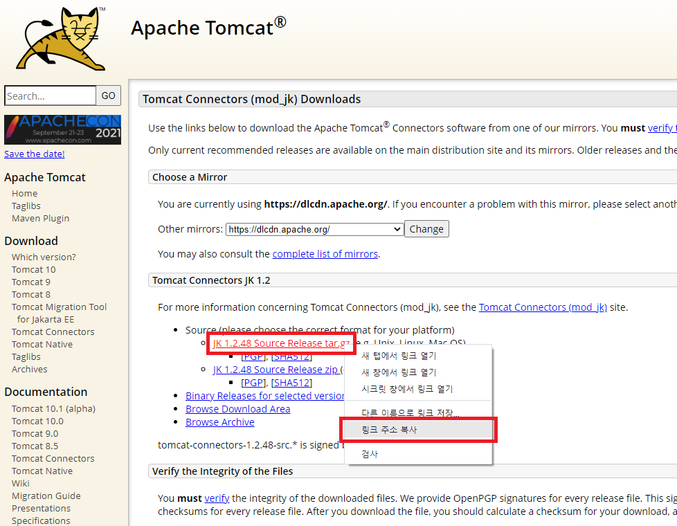 wget -c 복사한 링크 주소wget -c http://mirror.navercorp.com/apache/tomcat/tomcat-connectors/jk/tomcat-connectors-1.2.46-src.tar.gz2-2) 압축 풀기 및 폴더 이동