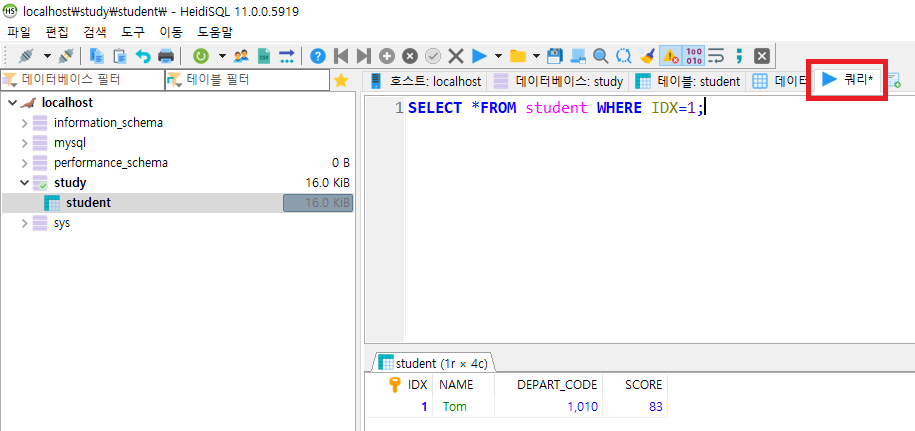 쿼리 탭으로 이동하여 직접 명령어를 입력하여 사용할 수도 있다.