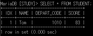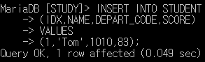 )INSERT INTO STUDENT (IDX,NAME,DEPART_CODE,SCORE) VALUES (1,'Tom',1010,83);