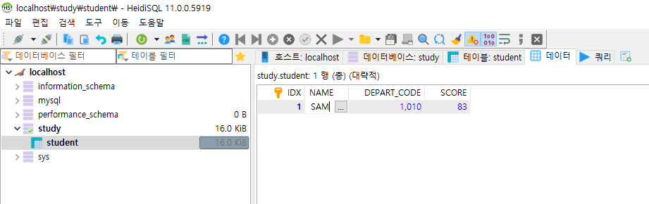 조건을 설정하지 않을 경우 모든 데이터가 삭제된다.DELETE FROM STUDENT WHERE IDX=1;