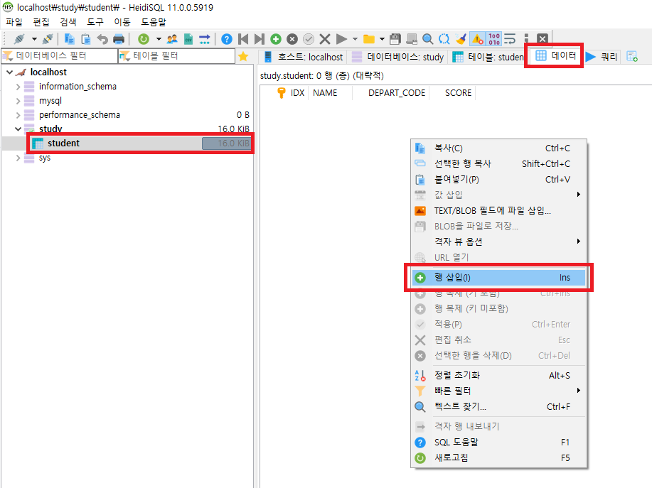 테이블 선택 후 데이터 탭 이동 → 데이터 영역에서 우 클릭 → 행 삽입